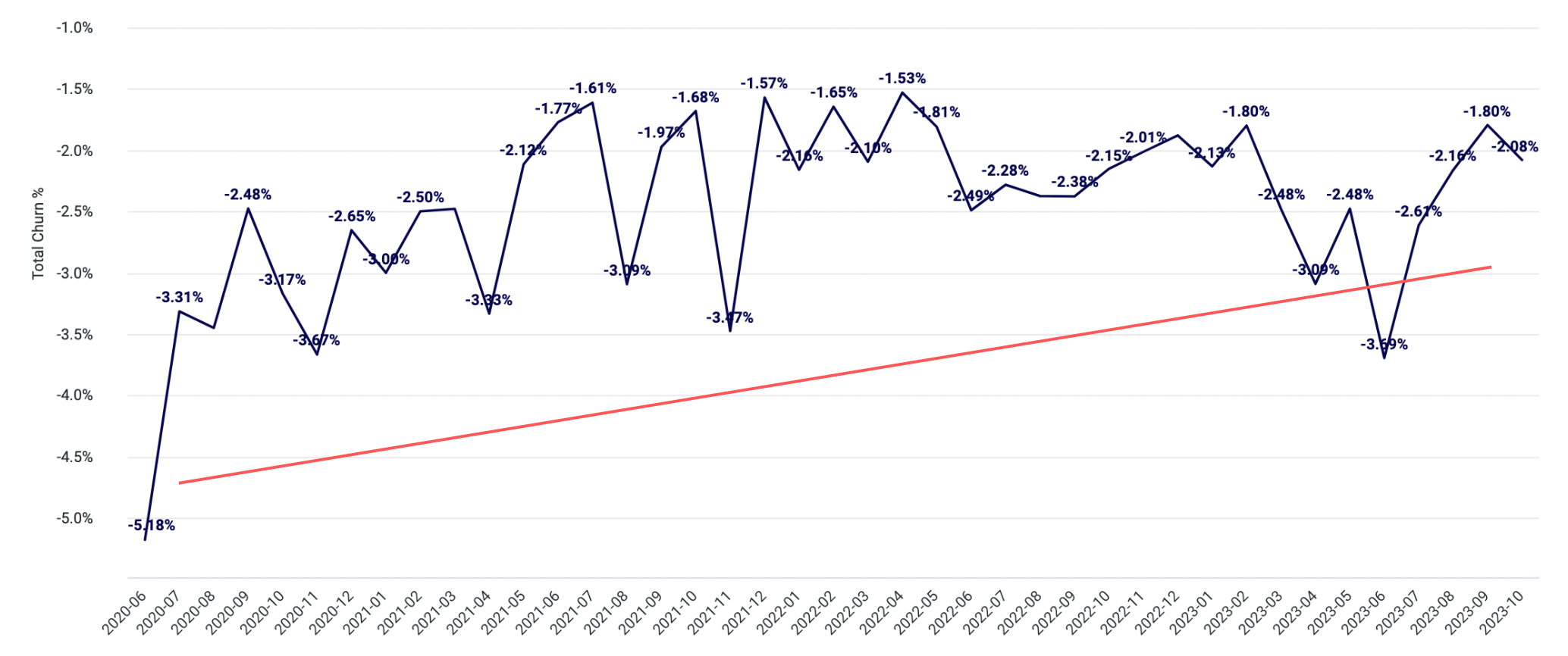 The chart below illustrates my Customer Success team's churn behavior as a percentage of recurring revenue. For example, a -5% value in June 2020 signifies a 5% cancellation of revenue for that month